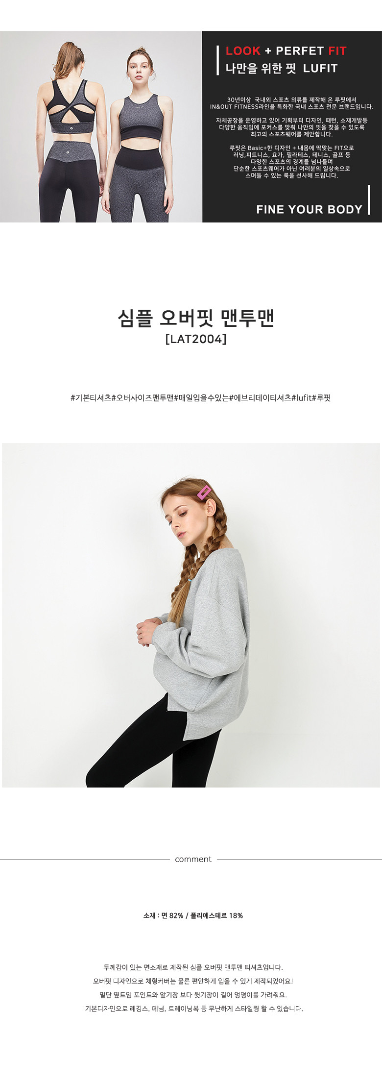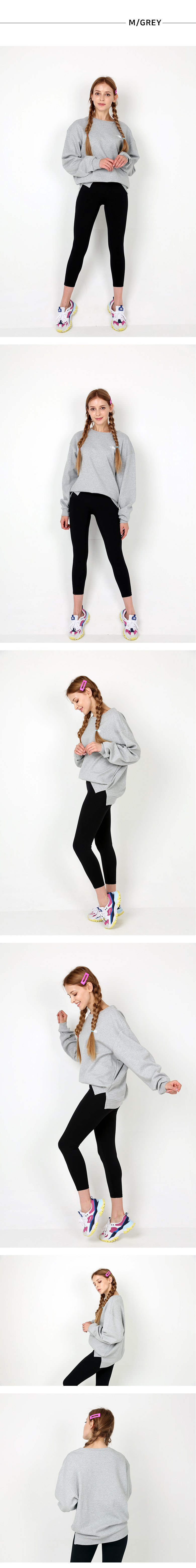어디에나 매치할수 있는 기본 오버핏 맨투맨 티셔츠에요! 긴 기장으로 루핏의 1인치레깅스와 매치해주세요~